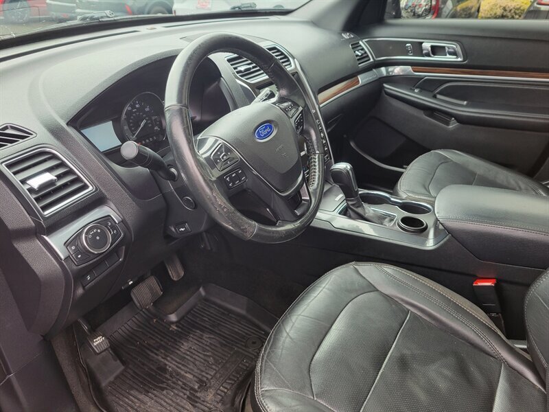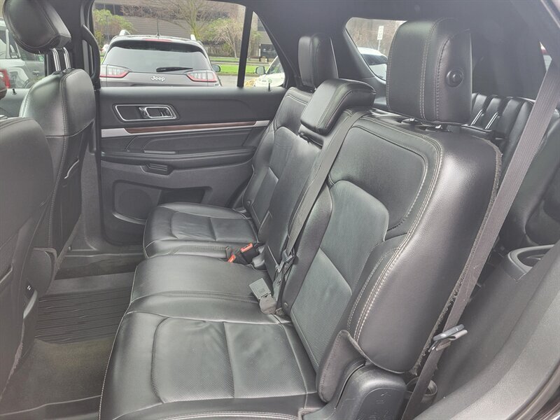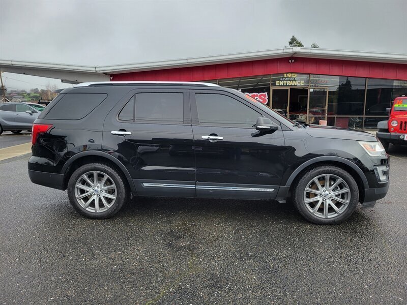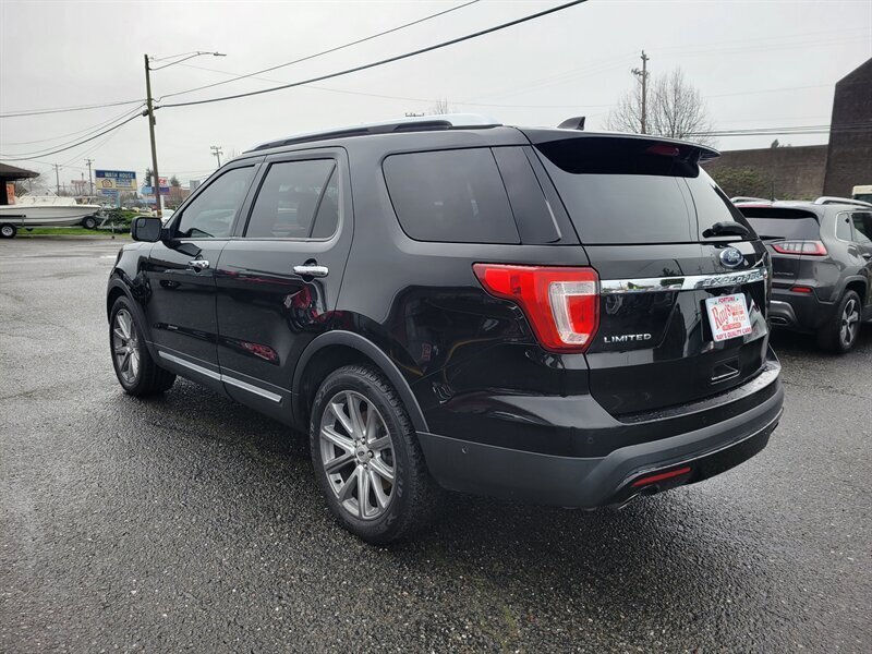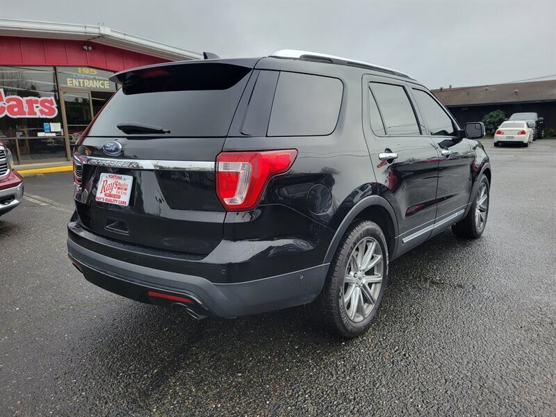 Brighten your driveway with this sleek 2017 Ford Explorer Limited in striking Black with a Black leather interior — in excellent overall condition and ready to go. Powered by a smooth 3.5L V6 (290 hp, 255 lb-ft), it comes from the factory with leather-trimmed seating, heated front seats and power-adjustable driver seating with memory, comfortable second- and third-row seating with easy-fold capability, and automatic climate control with rear vents. Factory convenience and tech include keyless entry with push-button start, power liftgate, roof rails, alloy wheels, fog lights, an intuitive SYNC infotainment touchscreen with Bluetooth/USB and available satellite radio, and a backup camera. Built with standard safety systems — ABS, stability/traction control and multiple airbags — this Explorer blends family-friendly utility with confident V6 performance.