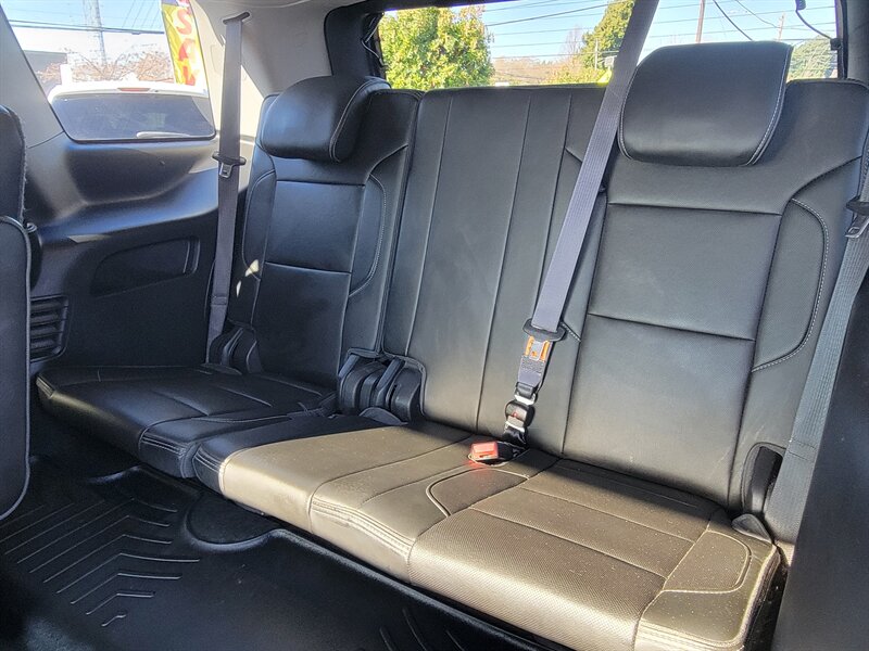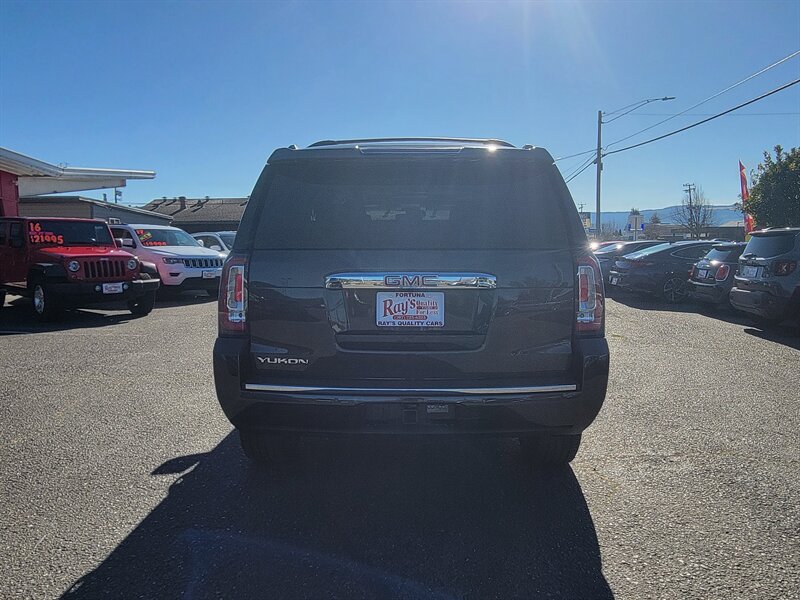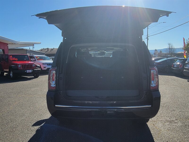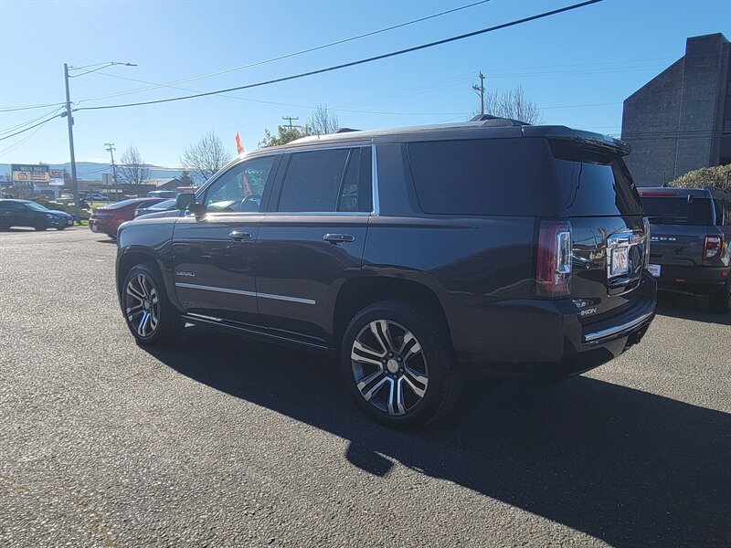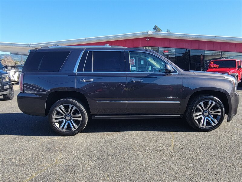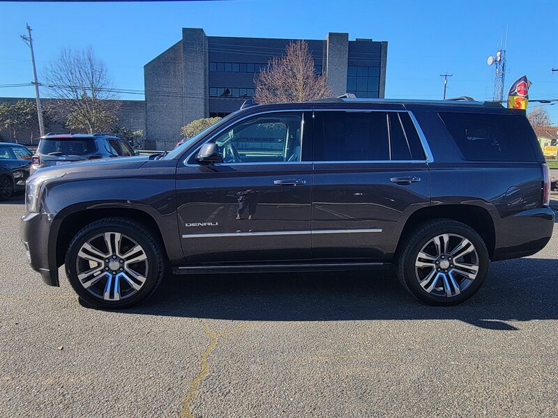Clean, one-owner 2017 GMC Yukon Denali finished in dark gray with a Jet Black interior — powered by the potent EcoTec3 6.2L V8 delivering 420 hp and 460 lb-ft of torque and in excellent overall condition. Factory Denali equipment includes premium leather-appointed seating with heated and ventilated front seats and heated second row, power-adjustable driver with memory, heated steering wheel, Denali chrome grille and polished wheels, Magnetic Ride Control adaptive suspension, power liftgate, tri-zone automatic climate control, keyless entry with push-button start and remote start, Bose premium audio and GMC infotainment with Bluetooth/USB connectivity and available navigation, rearview camera with rear parking sensors, power-folding third row, roof rails, and full-size towing capability. Ready for immediate enjoyment — upscale comfort, capability, and style all in one cheerful package!