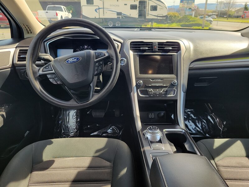 Clean, one-owner 2020 Ford Fusion SE in Agate Black with an Ebony interior — sporty, efficient, and in excellent overall condition. Powered by the turbocharged EcoBoost 1.5L I4 (181 hp / 185 lb-ft) with great fuel economy: 23 MPG city and 34 MPG highway. Factory-equipped with SYNC 3 8-inch touchscreen with Apple CarPlay and Android Auto, Bluetooth and USB connectivity, 6-speaker audio, rearview camera, remote keyless entry with push-button start, dual-zone climate control, 60/40 split-fold rear seats, 17" alloy wheels, and a full complement of safety equipment (ABS, traction/stability control and multiple airbags). Clean CARFAX report — ready to go!