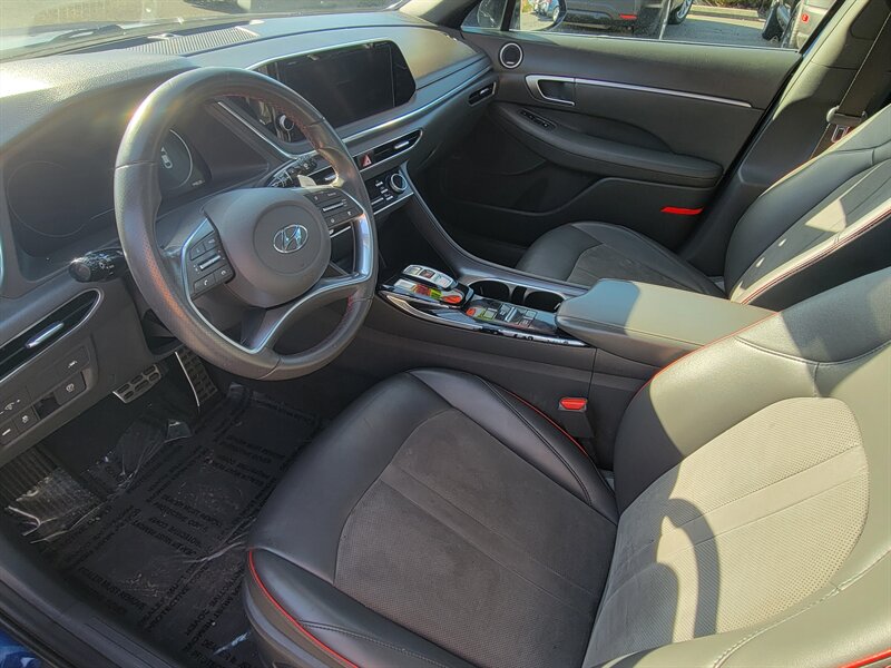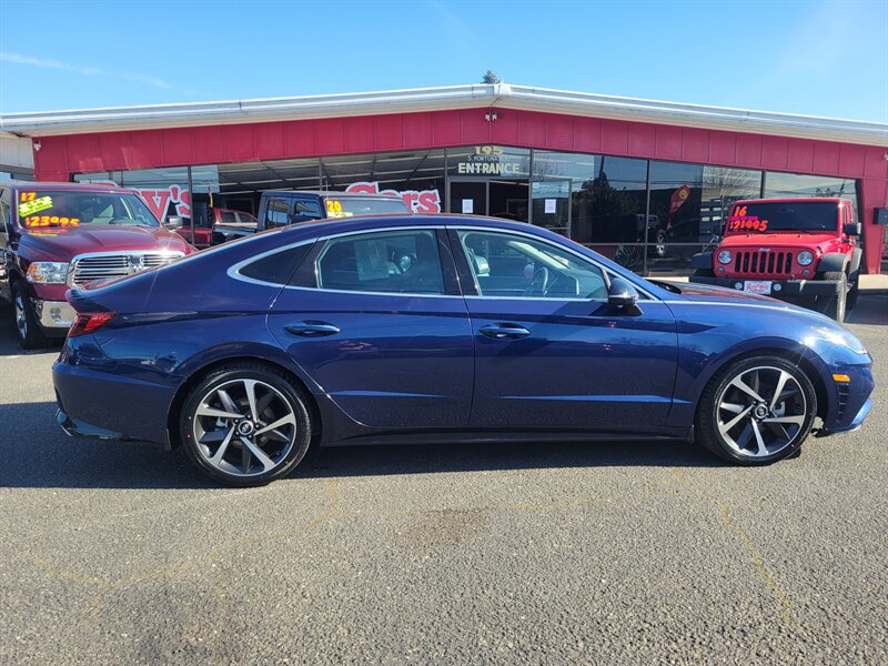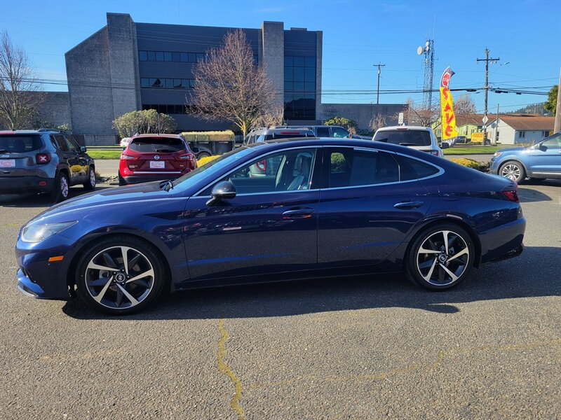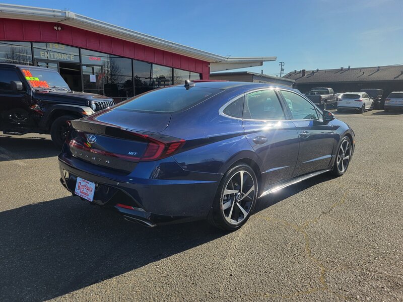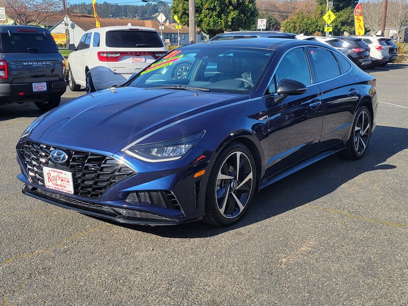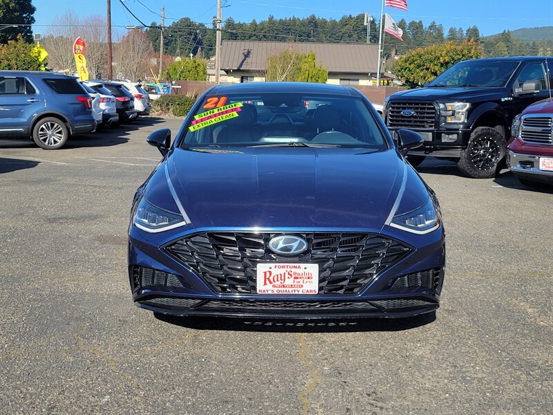 Bright and confident 2021 Hyundai Sonata SEL Plus in Stormy Sea with a Gray interior, powered by a 1.6L Turbo I4 delivering 180 hp and 195 lb-ft of torque — EPA-rated 27 MPG city / 37 MPG highway. Factory-equipped with an 8-inch touchscreen infotainment system with Apple CarPlay and Android Auto, Bluetooth and SiriusXM; dual-zone automatic climate control; proximity key with push-button start; heated front seats and a power-adjustable driver’s seat with leatherette seating surfaces; LED lighting, alloy wheels and a rearview camera. Safety is strong with Hyundai SmartSense features including forward collision-avoidance, lane keeping assist, blind-spot monitoring and rear cross-traffic alert. This Sonata is in excellent overall condition and ready to go!
